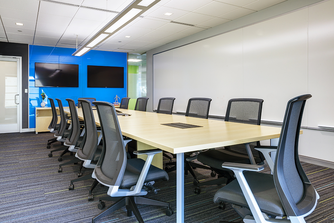 “Free Address” workplace, where employees chose their workstation via a scheduling system was a key component of the space plan. The interior space plan, incorporates various workstyles, promoting collaboration with the use of flexible benching workstations, flat screen monitors for teleconferencing, movable tables, and writeable glass surfaces.