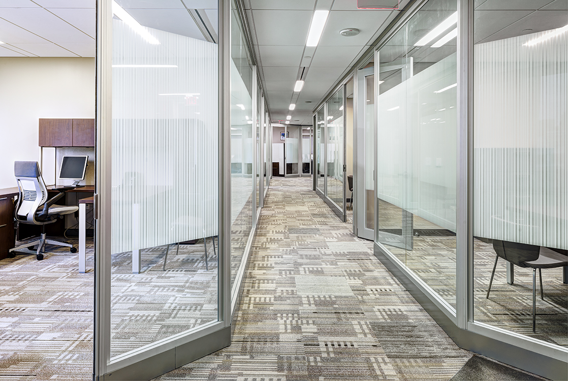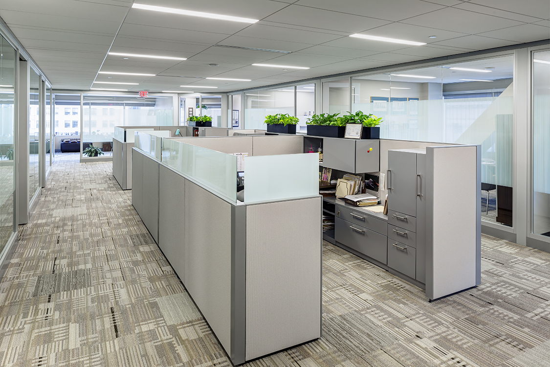 The open work spaces consist of a center bank of cubicles and partially frosted glass partitioned perimeter private offices, allowing natural light to emanate into interior spaces, while increasing social connection and engagement.