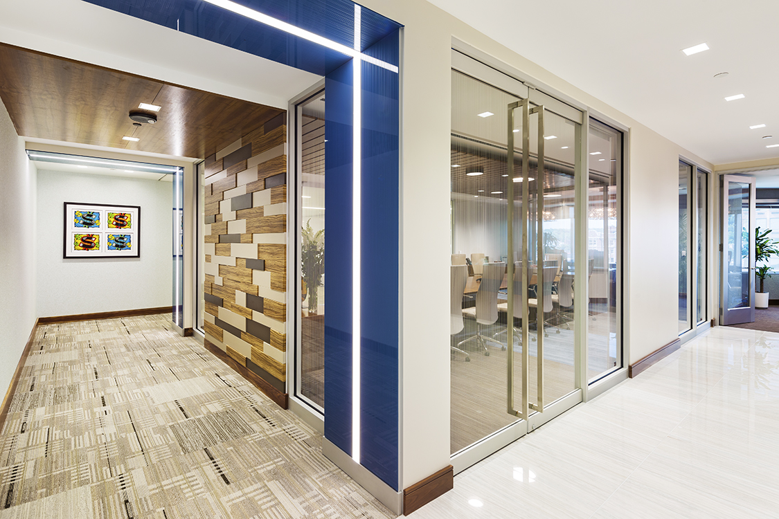 A neutral palette with intense color is used to brand the space. The design is minimalistic with dramatic accents of smooth, matte and lustrous materials such as glass cladded walls and ceilings, articulating wood wall treatments, natural textured textiles and carpeting.