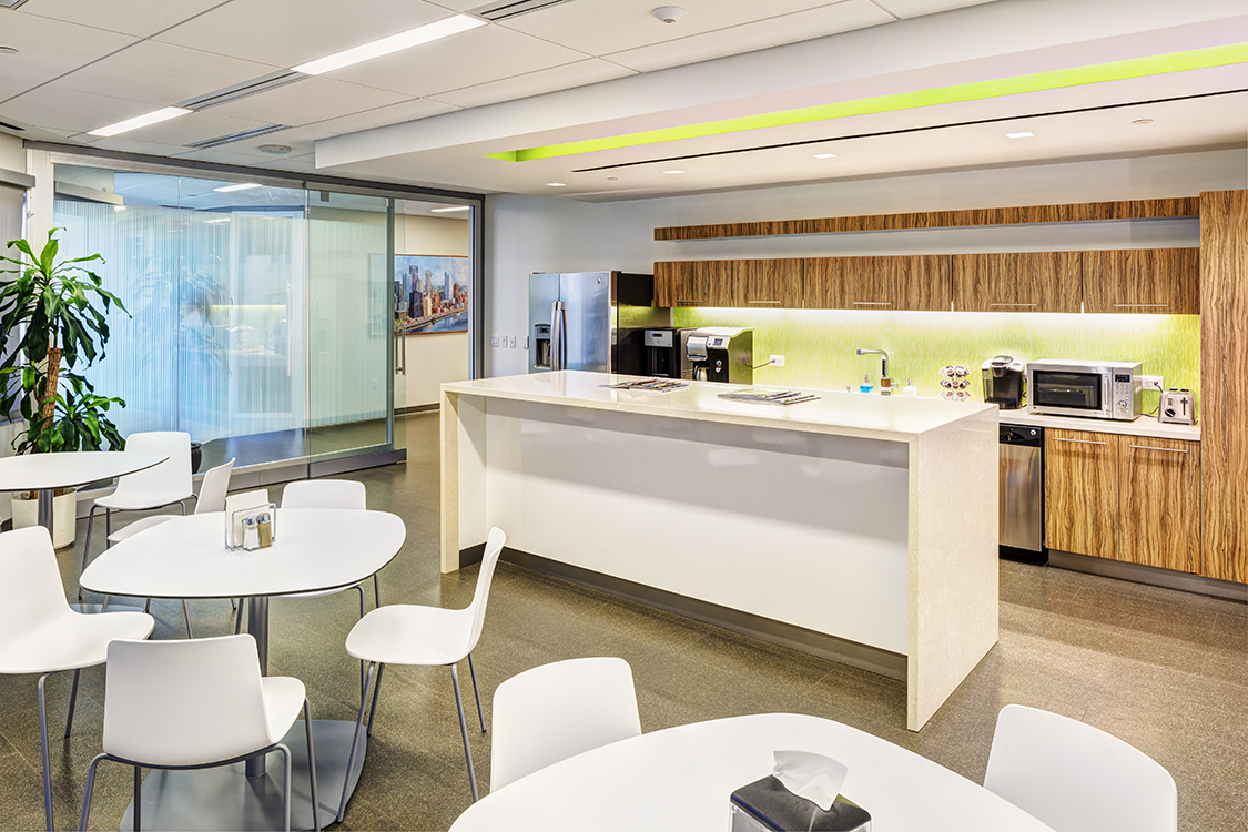 The café is a sleek and streamlined place to connect, collaborate and unwind, while enjoying views of the city. Contemporary cabinets and a community table are accentuated by a brightly painted linear light alcove.