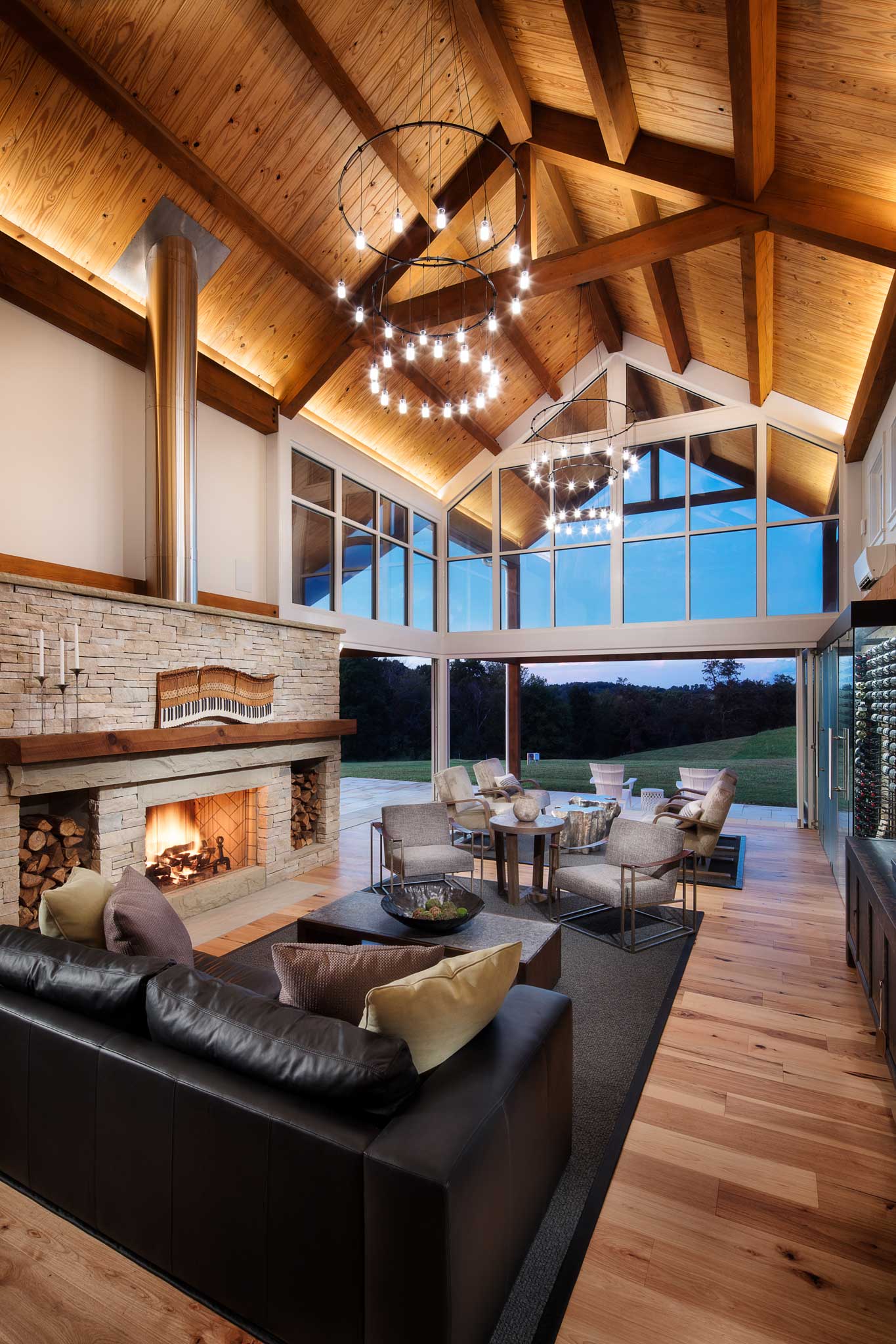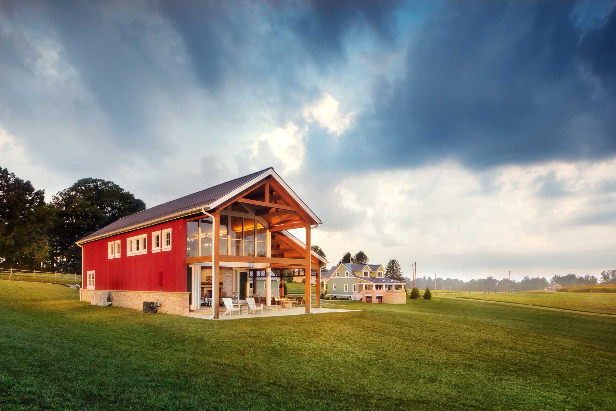 New timber frame entertainment barn structure located in rural southwest Pennsylvania. Originally, the homeowner tasked DLA+ with salvaging the barn and adapting it into a space for entertaining guests. When it was determined the barn could not be salvaged, it was demolished to make way for the new structure. The entertainment barn’s structural profile echoes the silhouette of the original barn. This was the third building renovated or built new on the multi-building, 16.5-acre parcel.