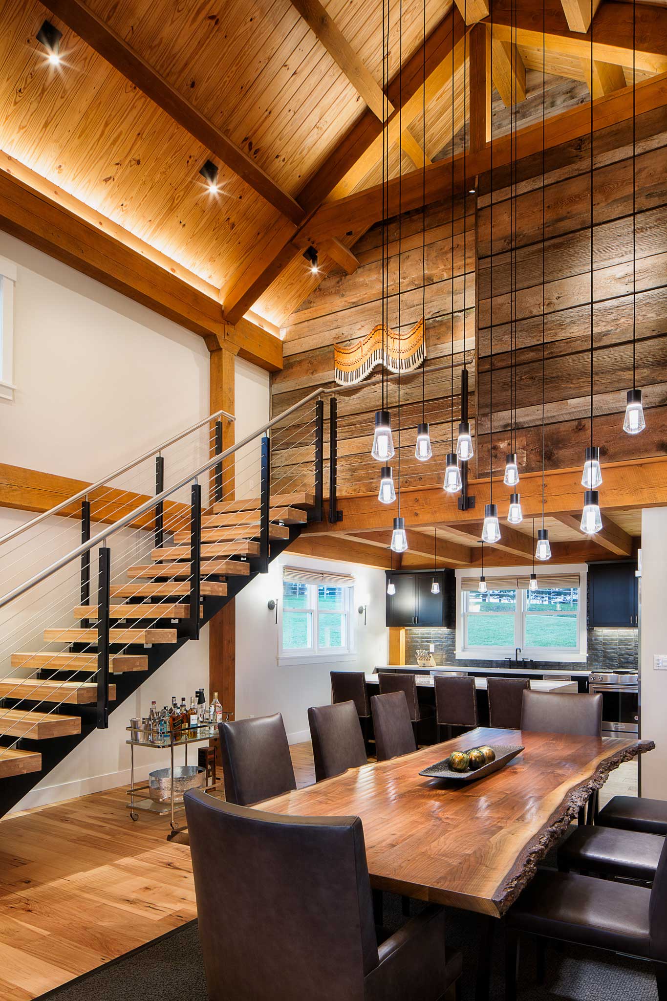 The old structure’s silhouette was replicated to pay homage to the original barn. True mortise and tenon timber joinery was detailed, reinforcing the acknowledgement. Original barn siding was repurposed to create wood slat walls that currently serve as interior focal points. The spacious great room and dining room expand outward to the exterior via a fold-open glass door panel system. The glass doors open to a large flagstone patio which is covered by the barn’s timber frame roof structure. Other spaces include a full kitchen, first floor master bedroom suite, and a second floor guest bedroom suite. Since the barn’s completion, the owner is enjoying more time in the barn’s expansive space and pleased with the effort to pay tribute to the old barn, which was a staple at the property for so many years.