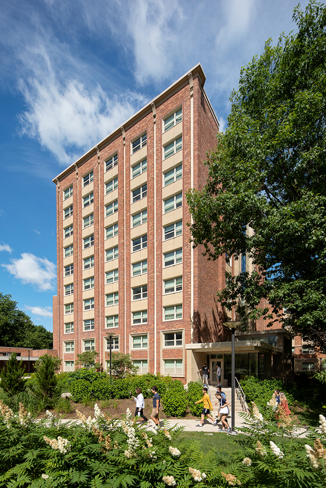 The newly renovated Brumbaugh Hall is ten stories with 300 beds. It has mainly double occupancy rooms with Resident Assistant single rooms, accessible rooms, and rooms for the hearing impaired. As with the other renovated and new buildings in East Halls, each floor will have single-user bathrooms that have both a shower and toilet to allow for privacy and additional toilet only restrooms. Modern amenities on the main levels include various TV lounges and study spaces, community kitchen, laundry room, meeting room, knowledge station, meditation room, Resident Life Office, and Housing Office.