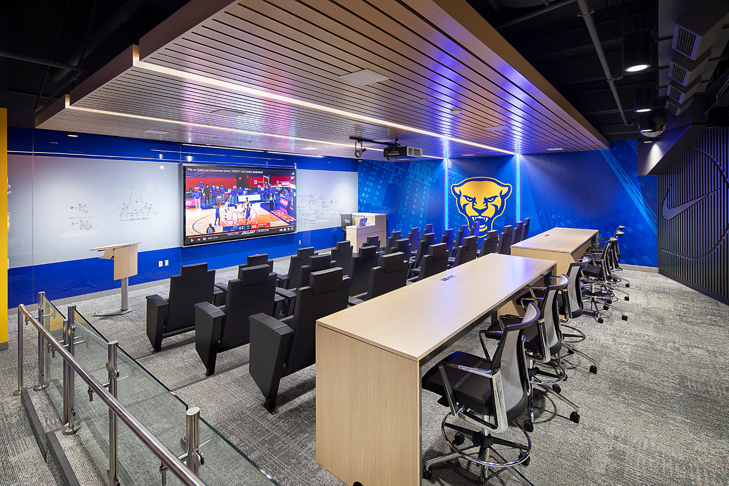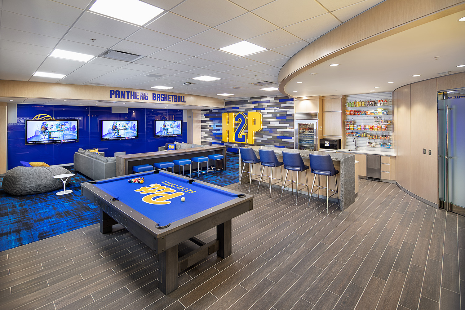 The spaces are outfitted with Pitt’s new brand colors and graphics and serve players, administrative staff, and coaches. The basketball suites competitively align the University with other Division I schools looking to recruit basketball players.