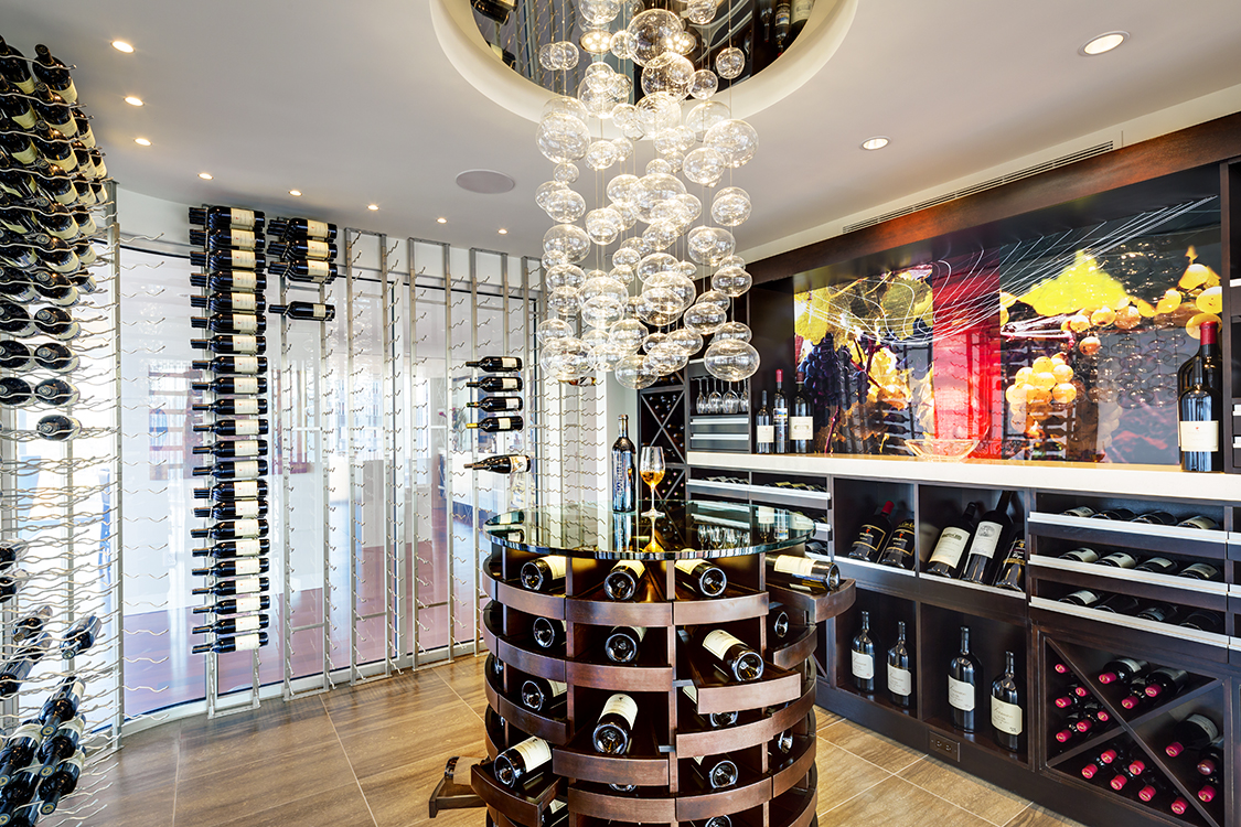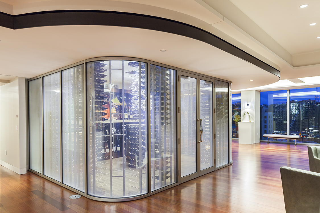 Wine to be celebrated and displayed, not hidden. Perhaps the most dramatic space in the unit, the Wine Cellar, features glass with a liquid crystal privacy film that creates the room’s enclosure to allow for concealing or revealing views into the space. Inside the cellar, the wine is truly on display like art with the wine racks lining the glass walls, a custom wine rose and wine credenza with custom artwork on the back wall. A crystal bubble chandelier hung over the cylindrical wine rose is the space’s focal point.