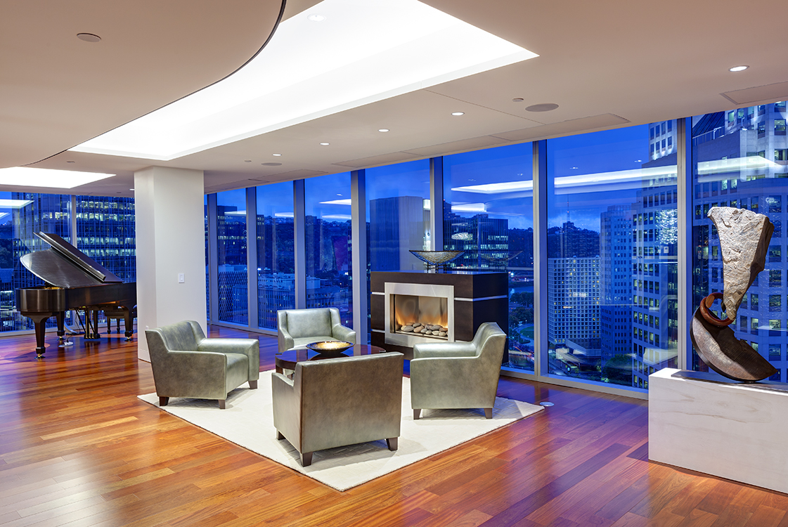 The city as the ultimate backdrop/wallpaper. Floor to ceiling curtain wall and views of nearly every city landmark could never be covered. The architects worked hard to design a floor plan that would ensure that all necessary infrastructure be in the core of the building around the elevator entry of the space. Lighting plays an important role in the design but never overpowers the uncompromising views of downtown Pittsburgh. Perhaps no place is this more evident than in the Music Hall and the Media Lounge where the city views leave one only able to stand back and take it in.