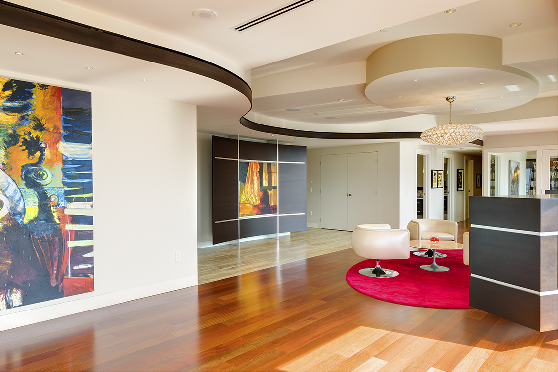 Create a space that told the tale of Art, Wine and a City. What do they have in common? An owner that looked to combine three units at The Residences Pittsburgh into one living space that showcased his three loves. To create this space the designers had to overcome a few challenges: floor to floor space constraints and showcasing the owner’s passions. The result was a 6,000 SF condo fit-out that offered the owner a living and entertaining space that functioned as a permanent art display for amazing art, impeccable wine and the breathtaking views of his beloved city.