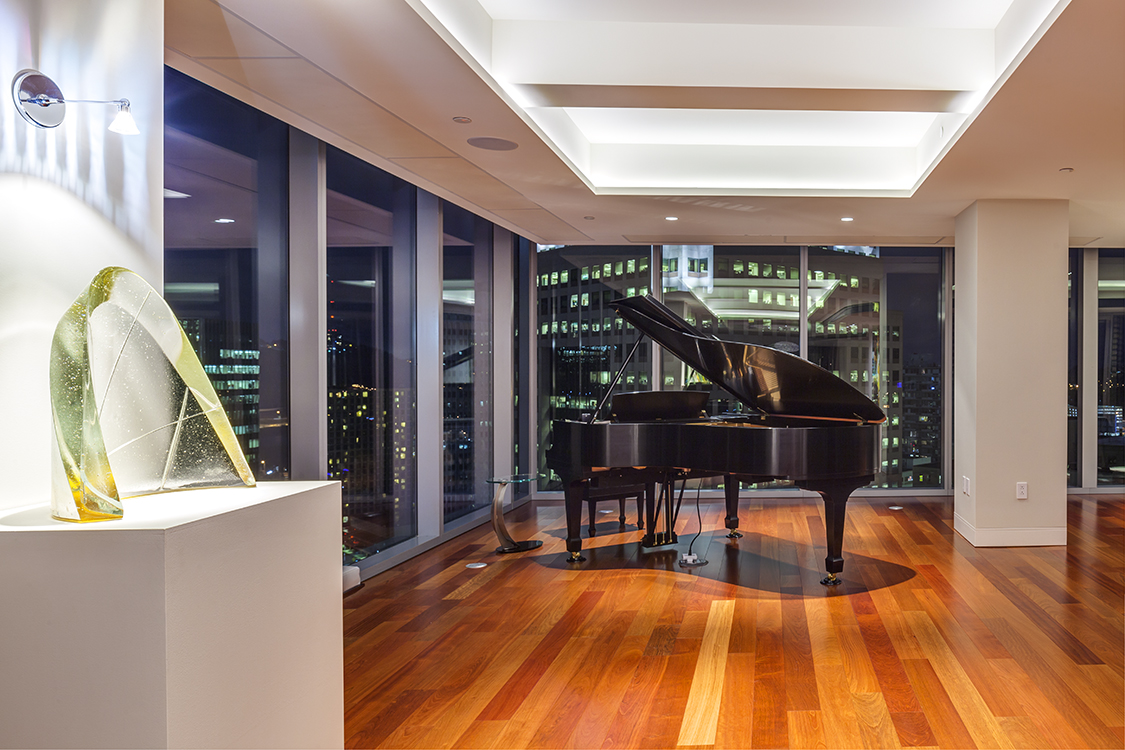 The unit as art and an art display. Very early in the design process it became clear that not only would the unit be housing great art and wine, the space itself would be a work of art. Throughout the unit its remarkable lines, custom features and attention to detail make a clear statement to the beauty of the space. The Fireside Entry Lounge features a dynamic custom curved fireplace unit with art shelving that mimics the curve of the oval ceiling soffit. In the center of the soffit a 30” diameter crystal chandelier hangs to define and ground the seating area. Behind the entry lounge a curved art wall features curved custom artwork frame that continues to translate the oval soffit. Beyond this lounge, the Music Hall and Steinway baby grand featuring lighting that illuminates the piano like a piece of art, create an almost “stage” like setting with Fifth Avenue Place as the backdrop.