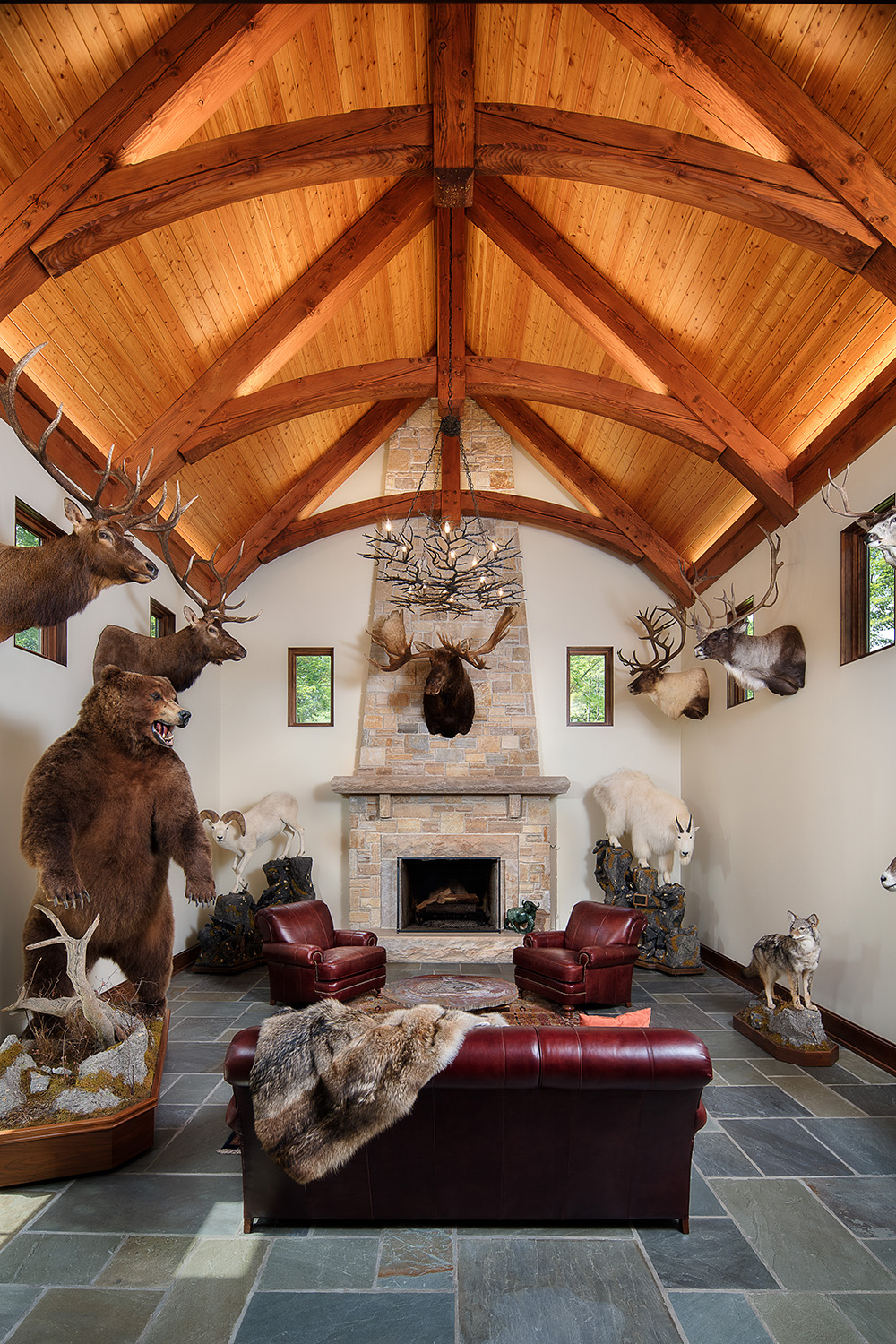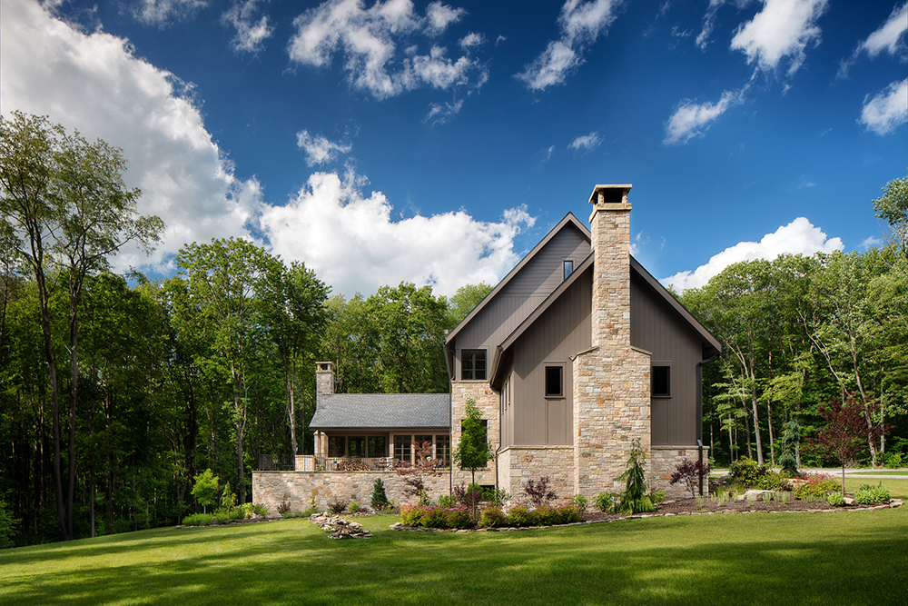The homeowner asked DLA+ to design a custom two-story residence on the family’s large rural wooded lot. The approximately 7,900 SF finished home provided 4 bedrooms, 2 ½ baths, 3 car garage/shop, and space for the residents’ interests including classical music, sportsmanship, oil painting and mechanics. The design team crafted a program and concept to incorporate these spaces while maintaining the site’s wooded surroundings to provide privacy and emphasize the natural beauty. The lower level features an art room. On the main level, a music room and library feature a baby grand piano and the trophy room highlights game with a cathedral ceiling and authentic mortise & tenon timber trusses. An elevated stone covered terrace provides additional opportunities to take in the wooded vistas. By focusing on lifestyle, the project helped the family transition from their urban residence to a rural home in northern Pennsylvania.