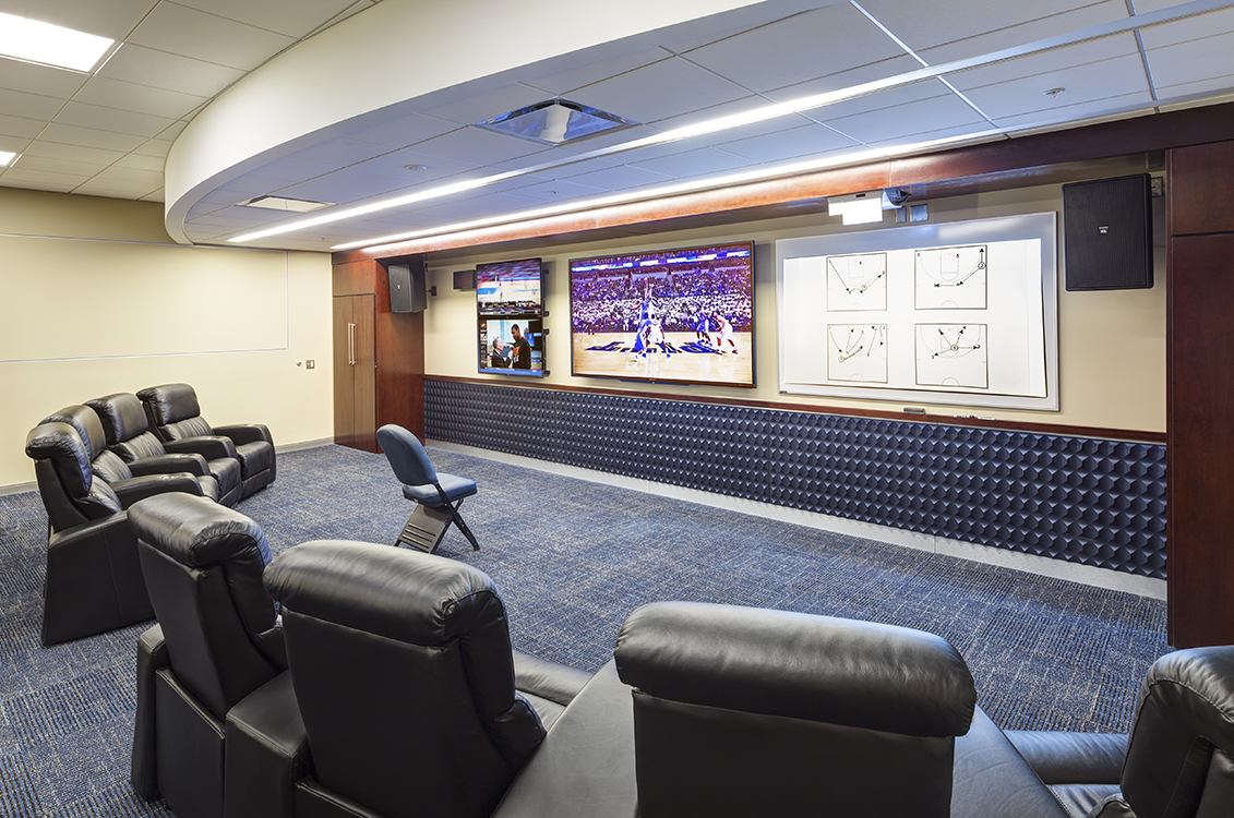 Technology is one of the major components of the redesign. Both the team viewing area in the lounge and locker room include a smart board with the ability to project an interactive image that gives the players and coaches the ability to review plays and strategies. In addition to the smart boards, there are several monitors allowing the coach to playback past games, review videos, and study opponents in the team viewing area.
