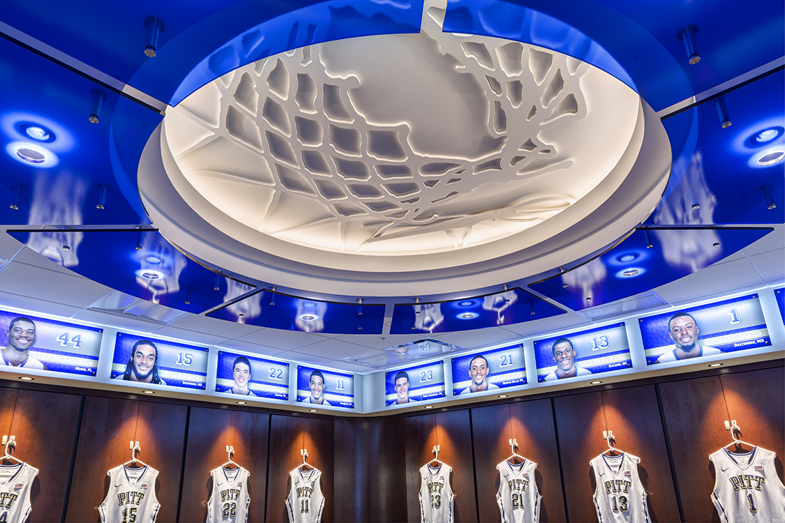 The University of Pittsburgh Basketball Program’s locker rooms had not been updated for since the completion of the Petersen Events Center in 2002. At the time the facility was designed, the focus on recruiting was a design consideration, but far below the degree that is required for today’s Universities to compete on a National level. Since joining a new athletic conference, the ACC, it became clear that an update of their space was necessary. The client’s goals for the design team were to reinvigorate a sense of team pride, update the suites, promote Pitt basketball and its legacy, and ultimately create a space that allowed Pitt to compete on a National level. Pitt needed to create an experience for its Division I Men and Women basketball players and recruits that resonates with the millennial generation; therefore, an impressive recruitment path that incorporated new technology was also a major focus in the redesign. The project was on a strict time-line for completion.