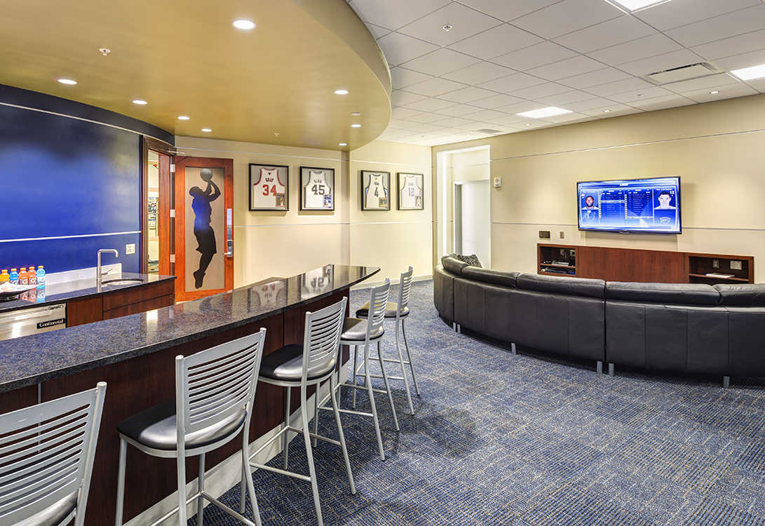 Upon entering the locker room suite, players and visitors are greeted with an expansive lounge, nutrition bar and team viewing area. The locker room is accessed from within the suite through the lounge. Individual wood lockers, capped by personalized player graphics surround the space. The ceiling design features an abstract of a net being cut with scissors, symbolizing an NCCA Championship. This graphic is recessed in a vault, surrounded by a halo of blue, back lit glass.
