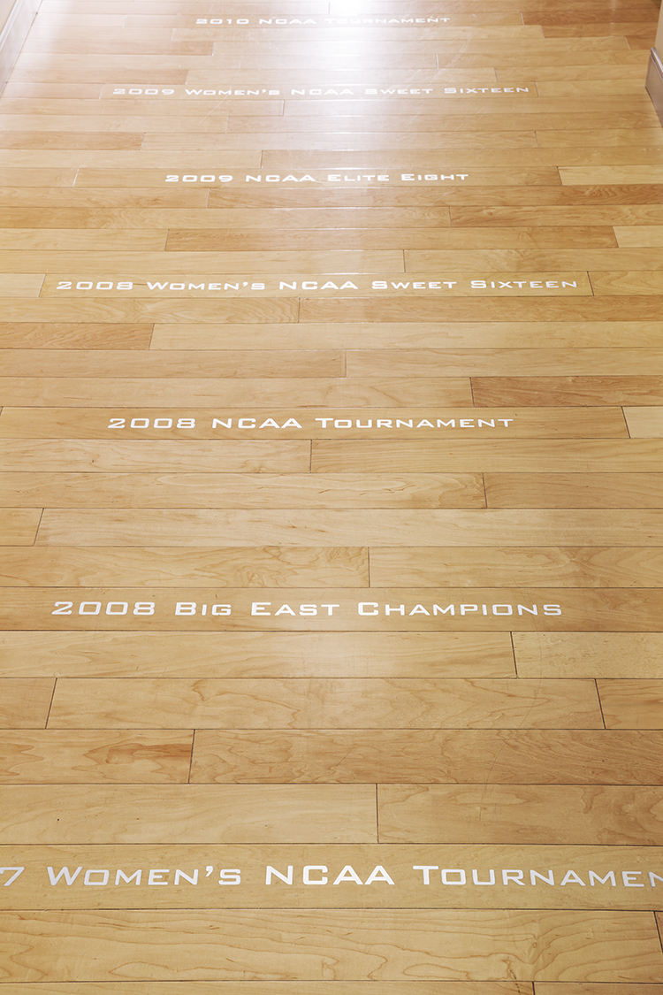 Off of the arrival hall, the hall of fame walk which highlights program milestones in the flooring and leads to the locker room suite entrances. Each locker room entry is on either side of a 3D abstract wall graphic of hoop netting highlighted by team branding. The floor of the locker entry, which is a maple basketball flooring material, is inset with a basketball inlay graphic.