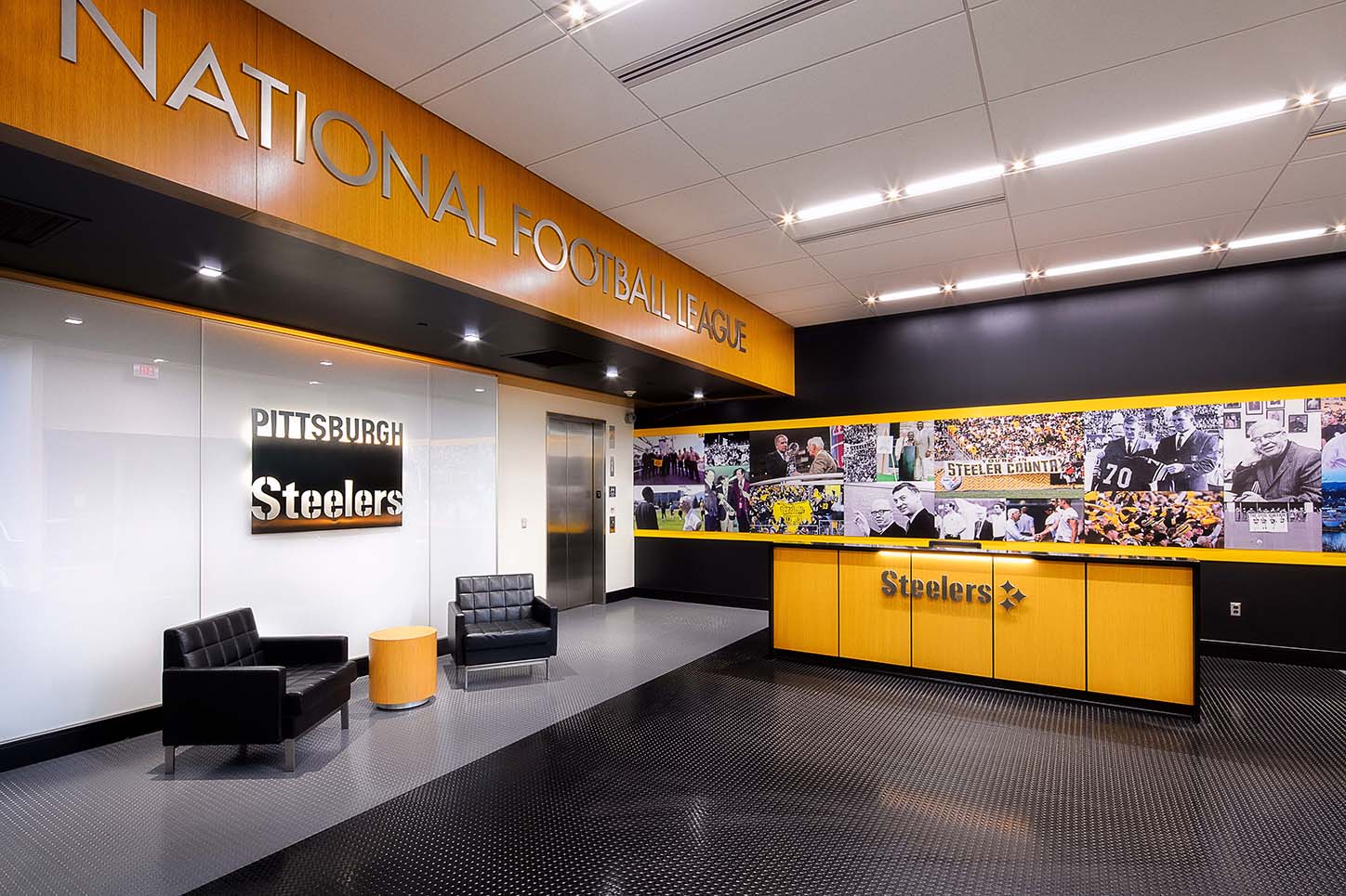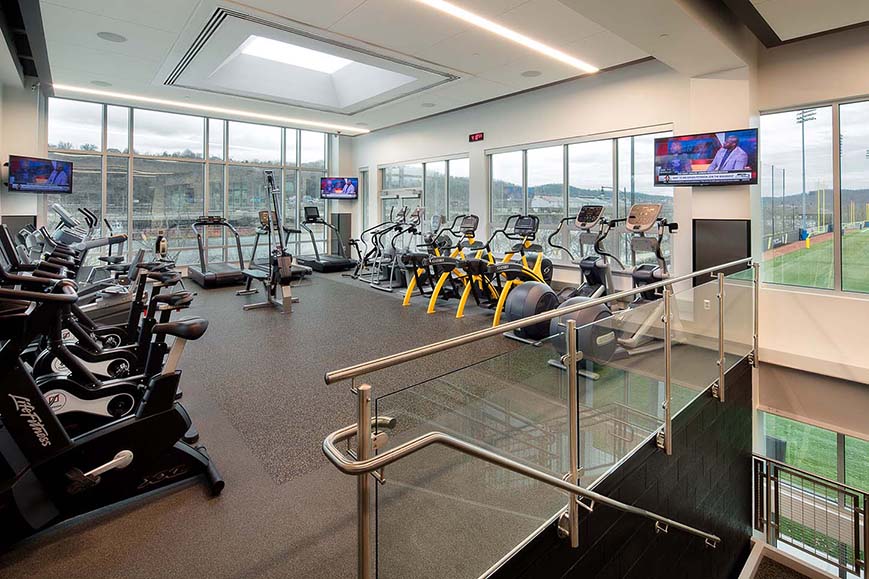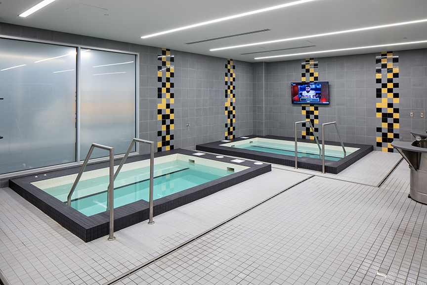 The addition and renovations doubled the size of the current weight and cardio areas in the training facility. The new second story addition allowed for more natural light and created a loft for the cardio room which provided views of the training fields and the river. Both areas featured state-of- the- art equipment. The hydrotherapy room received upgraded finishes and technology. The front entry addition allowed for better security and controlled access to both the Steelers’ facility and to the cafeteria for the University of Pittsburgh. Additionally, the renovated front lobby received finish and seating upgrades that conveyed the team’s brand. At the Indoor Facility, the team converted an awkwardly shape and sized space into offices for the team’s online and web group.